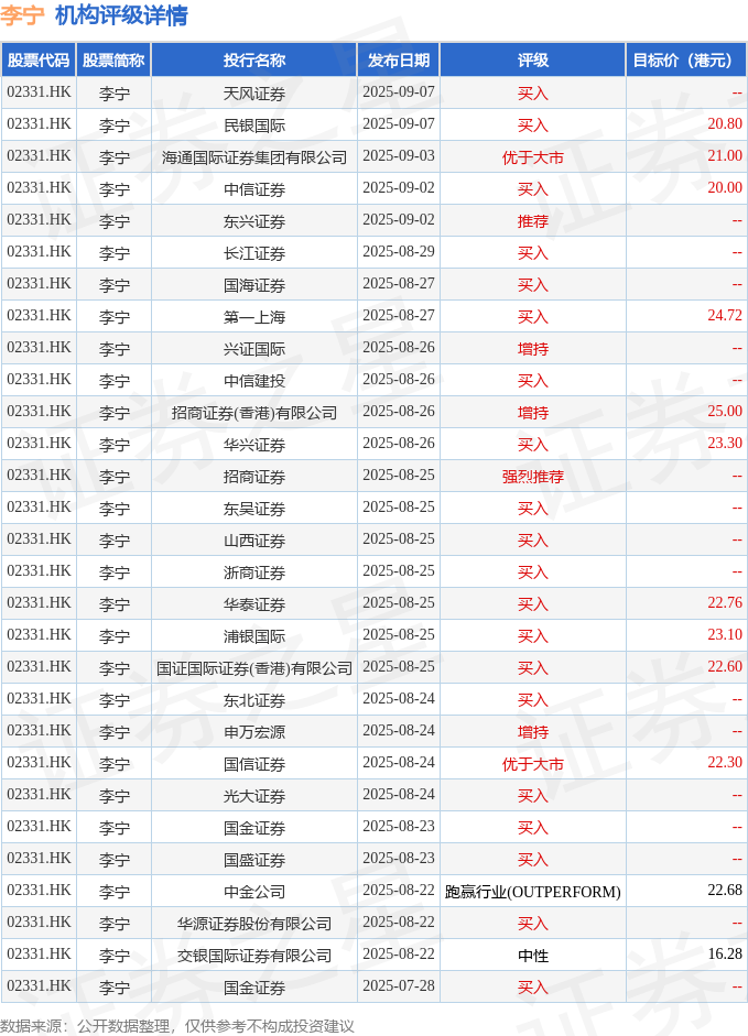 投行对该股的评级以买入为主,近90天内共有20家投行给出买入评级,近90天的目标均价为22.05港元。天风证券最新一份研报给予李宁买入评级。
