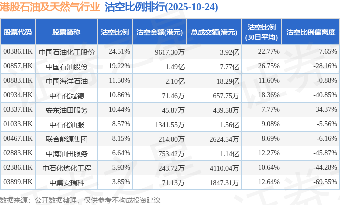 从沽空比例来看,中国石油化工股份、中国石油股份、中国海洋石油沽空比例位居行业前三,分别为24.51%、19.22%、11.5%。