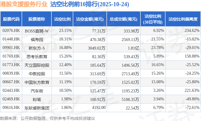 从沽空比例来看,BOSS直聘-W、福寿园、新东方-S沽空比例位居行业前三,分别为23.15%、18.31%、16.88%。