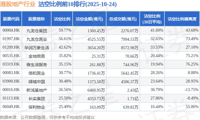 从沽空比例来看,九龙仓集团、九龙仓置业、华润万象生活沽空比例位居行业前三,分别为59.77%、56.61%、42.62%。