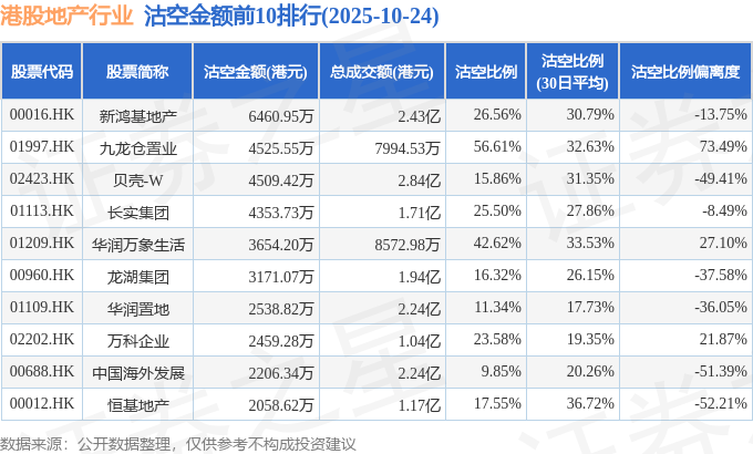 从沽空金额来看,新鸿基地产、九龙仓置业、贝壳-W沽空金额位居行业前三,分别为6460.95万港元、4525.55万港元、4509.42万港元。