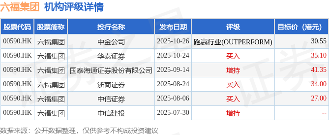 投行对该股的评级以买入为主,近90天内共有3家投行给出买入评级,近90天的目标均价为33.6港元。中金公司最新一份研报给予六福集团跑赢行业(OUTPERFORM)评级,目标价30.55港元。
