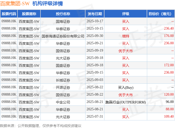 投行对该股的评级以买入为主,近90天内共有9家投行给出买入评级,近90天的目标均价为163.31港元。国海证券最新一份研报给予百度集团-SW买入评级。