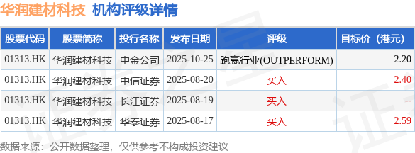 投行对该股的评级以买入为主,近90天内共有3家投行给出买入评级,近90天的目标均价为2.4港元。中金公司最新一份研报给予华润建材科技跑赢行业(OUTPERFORM)评级,目标价2.2港元。