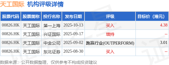 投行对该股的评级以买入为主,近90天内共有2家投行给出买入评级,近90天的目标均价为3.7港元。第一上海最新一份研报给予天工国际买入评级,目标价4.38港元。