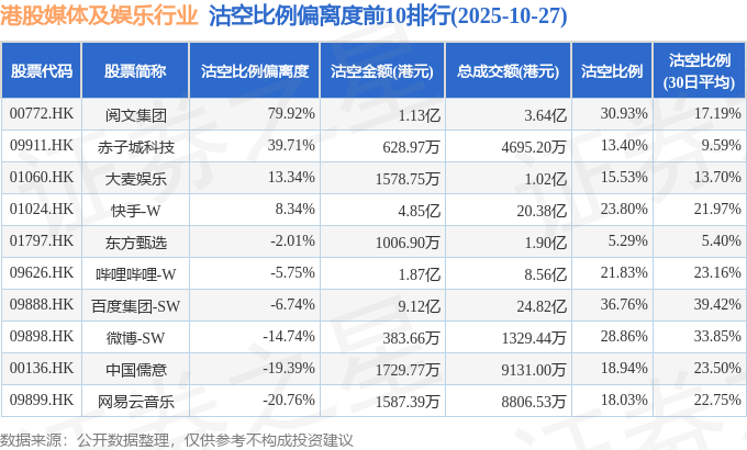 从沽空比例偏离度来看,阅文集团、赤子城科技、大麦娱乐沽空比例偏离度位居行业前三,分别为79.92%、39.71%、13.34%。