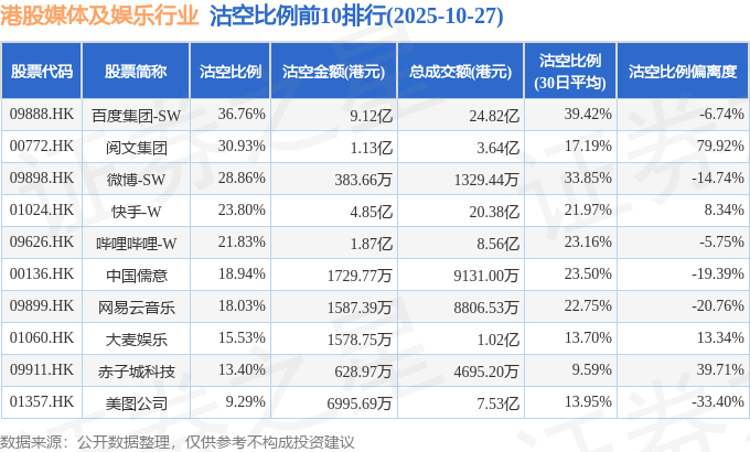 从沽空比例来看,百度集团-SW、阅文集团、微博-SW沽空比例位居行业前三,分别为36.76%、30.93%、28.86%。