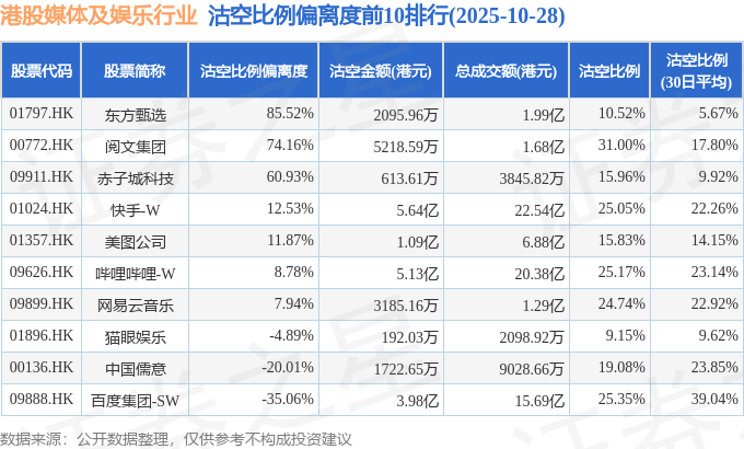 从沽空比例偏离度来看,东方甄选、阅文集团、赤子城科技沽空比例偏离度位居行业前三,分别为85.52%、74.16%、60.93%。