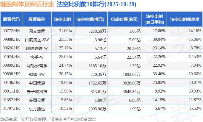 从沽空比例来看,阅文集团、百度集团-SW、哔哩哔哩-W沽空比例位居行业前三,分别为31%、25.35%、25.17%。