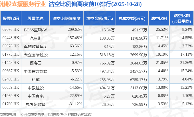 从沽空比例偏离度来看,BOSS直聘-W、汽车街、卓越教育集团沽空比例偏离度位居行业前三,分别为209.62%、157.48%、63.56%。