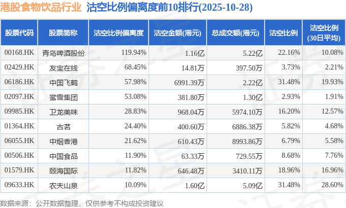从沽空比例偏离度来看,青岛啤酒股份、友宝在线、中国飞鹤沽空比例偏离度位居行业前三,分别为119.94%、68.45%、57.98%。