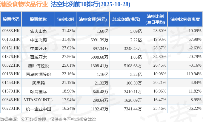 从沽空比例来看,农夫山泉、中国飞鹤、中国旺旺沽空比例位居行业前三,分别为31.48%、31.48%、27.62%。