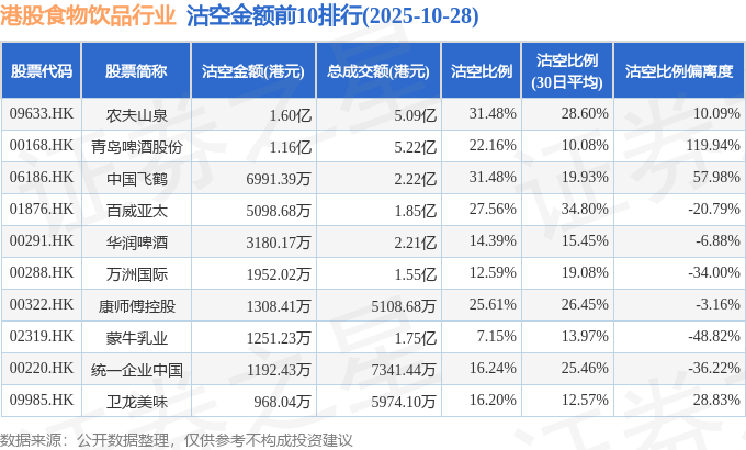从沽空金额来看,农夫山泉、青岛啤酒股份、中国飞鹤沽空金额位居行业前三,分别为1.6亿港元、1.16亿港元、6991.39万港元。
