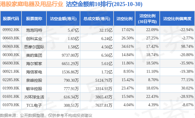 由于港股人民币柜台交易股票成交金额较小,沽空比例普遍偏高,为了避免干扰,已将人民币柜台交易股票从排行表格中剔除。