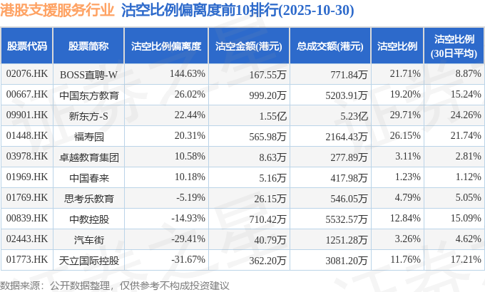 从沽空比例偏离度来看,BOSS直聘-W、中国东方教育、新东方-S沽空比例偏离度位居行业前三,分别为144.63%、26.02%、22.44%。