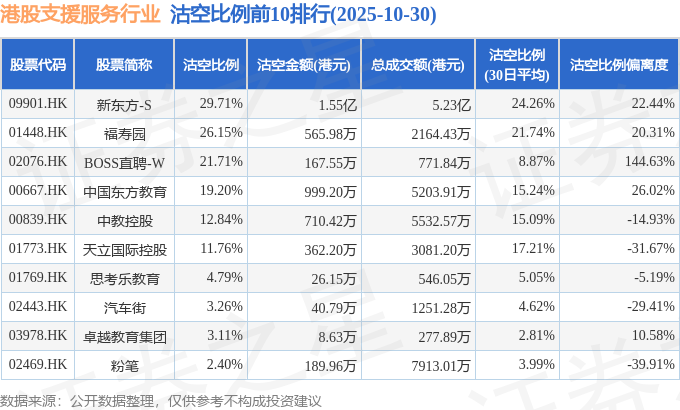从沽空比例来看,新东方-S、福寿园、BOSS直聘-W沽空比例位居行业前三,分别为29.71%、26.15%、21.71%。