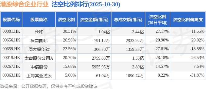 从沽空金额来看,长和、中信股份、太古股份公司A沽空金额位居行业前三,分别为1.04亿港元、5955.95万港元、2759.83万港元。