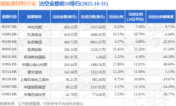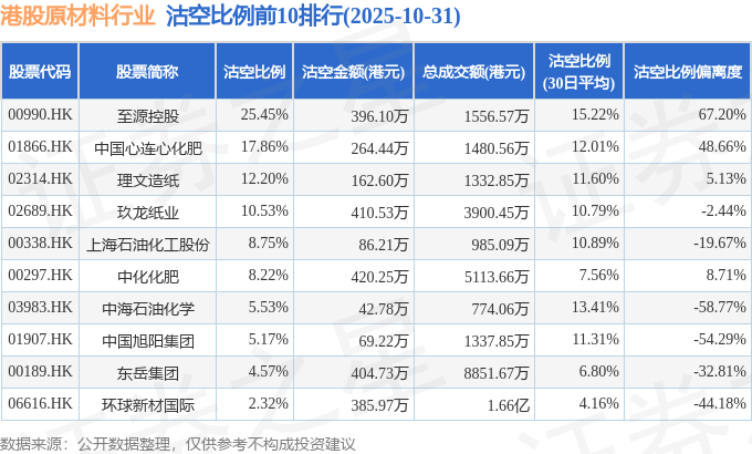 从沽空比例来看,至源控股、中国心连心化肥、理文造纸沽空比例位居行业前三,分别为25.45%、17.86%、12.2%。