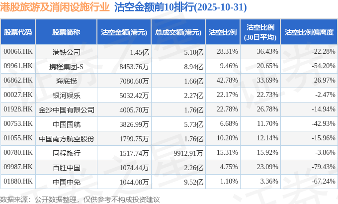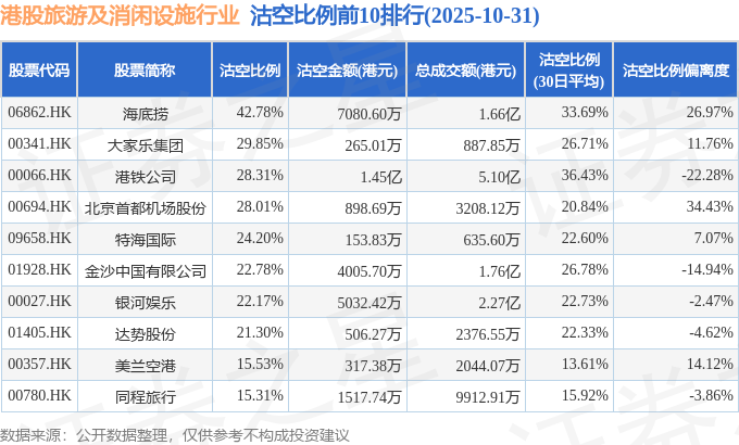 证券之星消息,10月31日港交所披露数据显示,当日港股旅游及消闲设施行业的134只个股中有31只被沽空,总沽空股数为4549.22万股,总沽空金额为5.6亿元(港元),而当日旅游及消闲设施行业的总成交金额为48.6亿元(港元),沽空比例为11.53%。当日旅游及消闲设施行业总体跌0.5%。