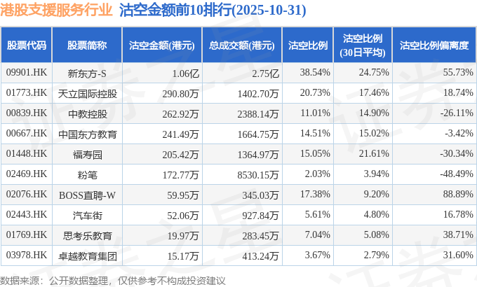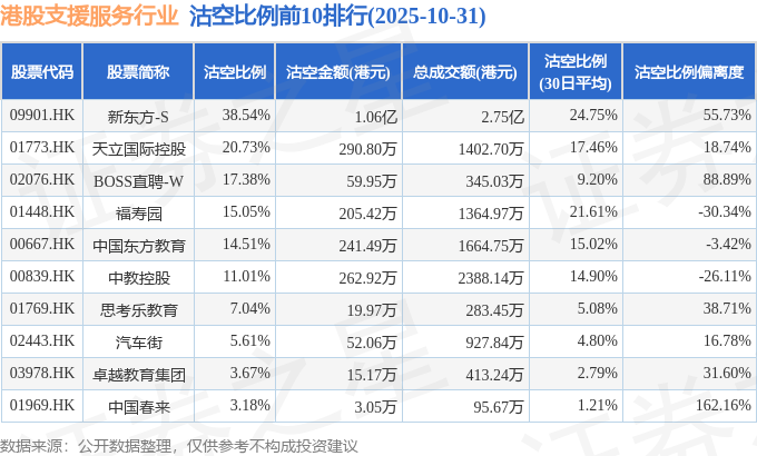 从沽空比例来看,新东方-S、天立国际控股、BOSS直聘-W沽空比例位居行业前三,分别为38.54%、20.73%、17.38%。