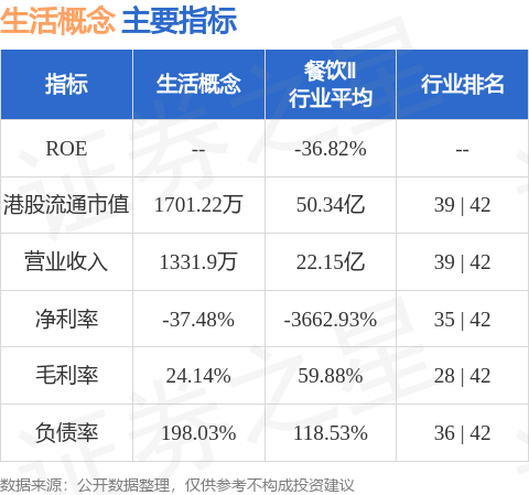 生活概念港股市值1701.22万港元,在餐饮Ⅱ行业中排名第39。主要指标见下表: