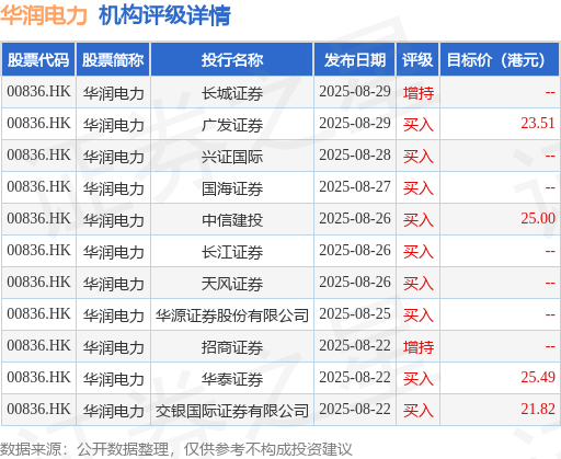 截至2025年10月31日收盘,华润电力(00836.HK)报收于18.58港元,下跌0.91%,成交量1770.69万股,成交额3.3亿港元。投行对该股的评级以买入为主,近90天内共有9家投行给出买入评级,近90天的目标均价为23.96港元。长城证券最新一份研报给予华润电力增持评级。