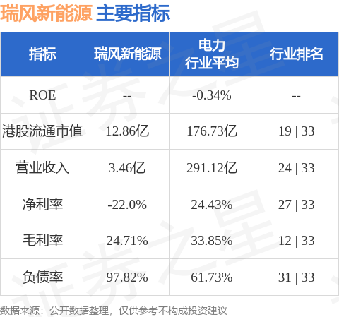 瑞风新能源港股市值12.86亿港元,在电力行业中排名第19。主要指标见下表: