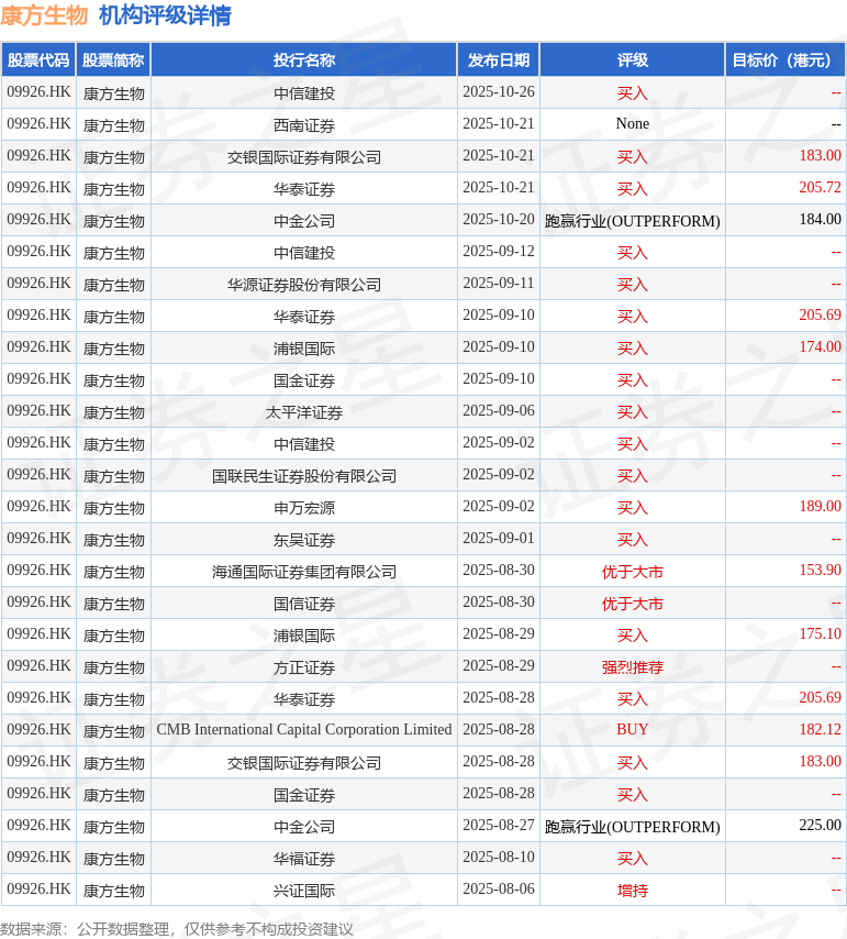 投行对该股的评级以买入为主,近90天内共有18家投行给出买入评级,近90天的目标均价为188.85港元。中信建投最新一份研报给予康方生物买入评级。