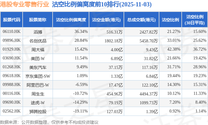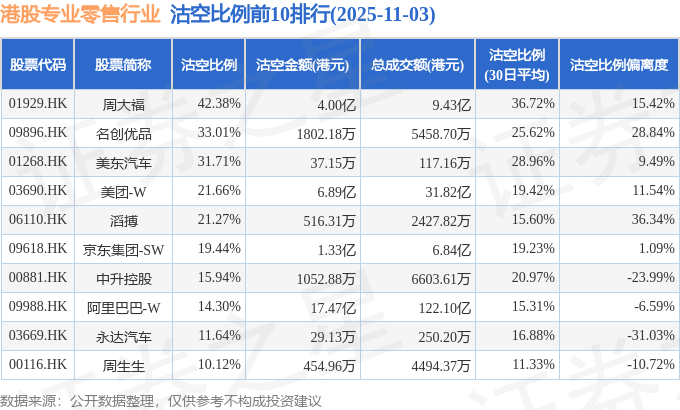 从沽空比例来看,周大福、名创优品、美东汽车沽空比例位居行业前三,分别为42.38%、33.01%、31.71%。