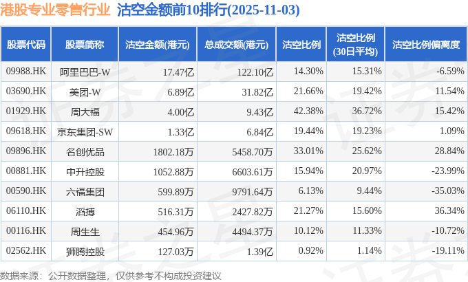 从沽空金额来看,阿里巴巴-W、美团-W、周大福沽空金额位居行业前三,分别为17.47亿港元、6.89亿港元、4亿港元。