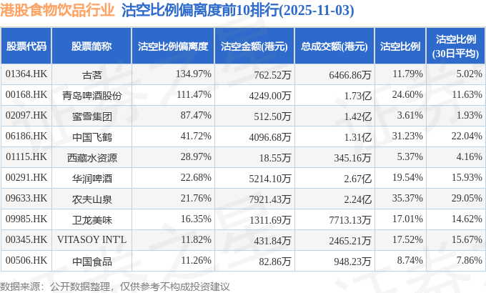 从沽空比例偏离度来看,古茗、青岛啤酒股份、蜜雪集团沽空比例偏离度位居行业前三,分别为134.97%、111.47%、87.47%。