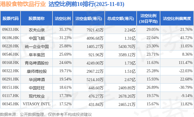 从沽空比例来看,农夫山泉、中国飞鹤、统一企业中国沽空比例位居行业前三,分别为35.37%、31.23%、25.88%。