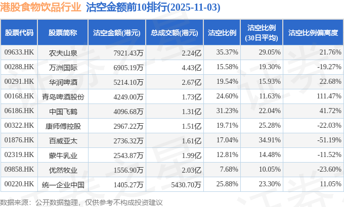 从沽空金额来看,农夫山泉、万洲国际、华润啤酒沽空金额位居行业前三,分别为7921.43万港元、6905.19万港元、5214.1万港元。