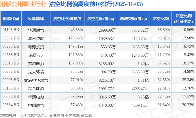从沽空比例偏离度来看,华润燃气、北京控股、粤海投资沽空比例偏离度位居行业前三,分别为246.58%、173.83%、149.31%。