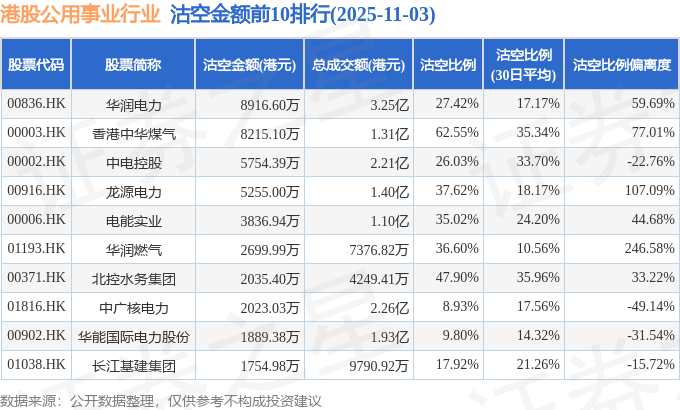 从沽空金额来看,华润电力、香港中华煤气、中电控股沽空金额位居行业前三,分别为8916.6万港元、8215.1万港元、5754.39万港元。