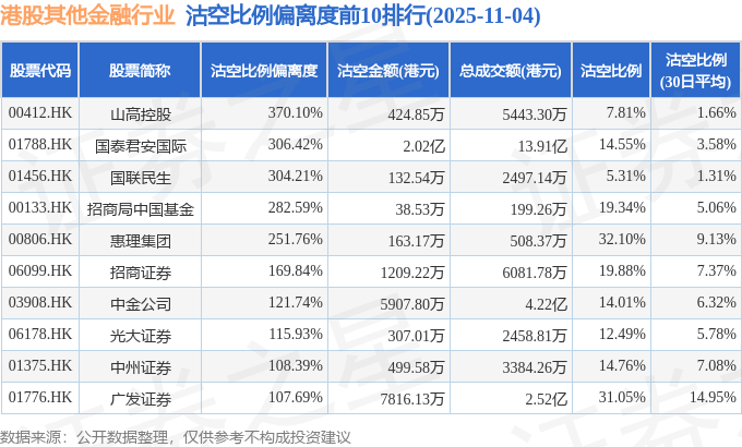 从沽空比例偏离度来看,山高控股、国泰君安国际、国联民生沽空比例偏离度位居行业前三,分别为370.1%、306.42%、304.21%。