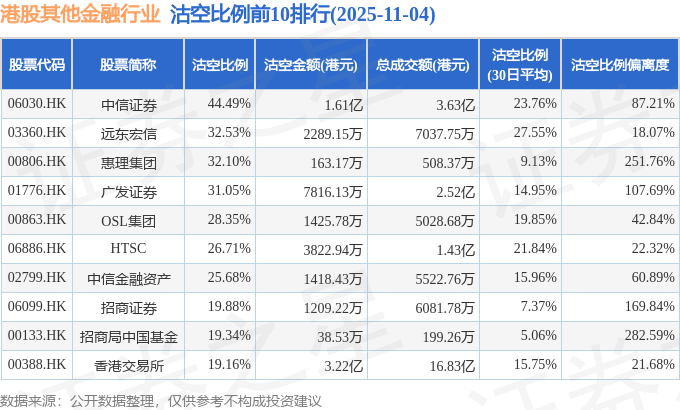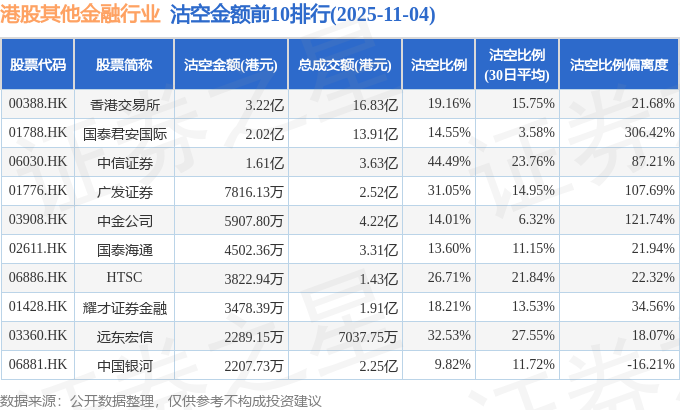 从沽空金额来看,香港交易所、国泰君安国际、中信证券沽空金额位居行业前三,分别为3.22亿港元、2.02亿港元、1.61亿港元。