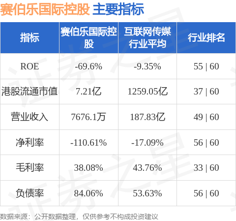赛伯乐国际控股港股市值7.21亿港元,在互联网传媒行业中排名第37。主要指标见下表: