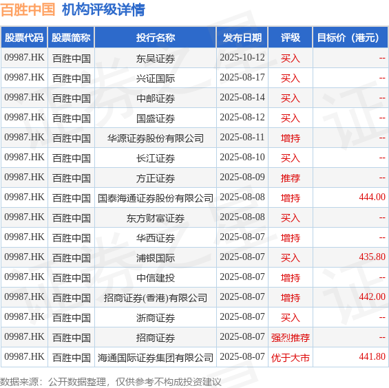 投行对该股的评级以买入为主,近90天内共有8家投行给出买入评级,近90天的目标均价为440.9港元。东吴证券最新一份研报给予百胜中国买入评级。
