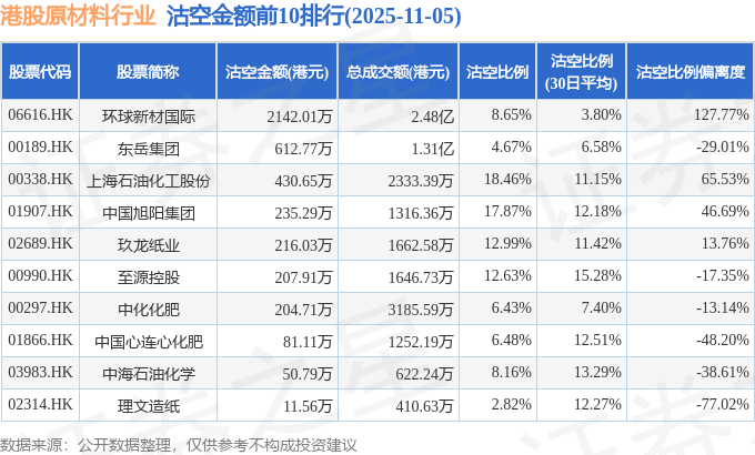 从沽空比例偏离度来看,环球新材国际、上海石油化工股份、中国旭阳集团沽空比例偏离度位居行业前三,分别为127.77%、65.53%、46.69%。