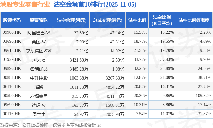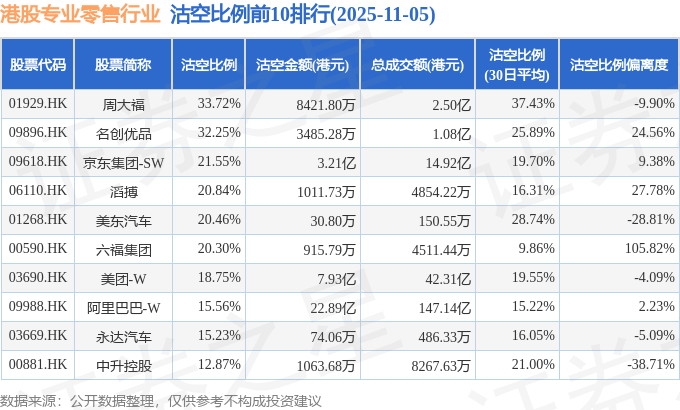 从沽空比例来看,周大福、名创优品、京东集团-SW沽空比例位居行业前三,分别为33.72%、32.25%、21.55%。