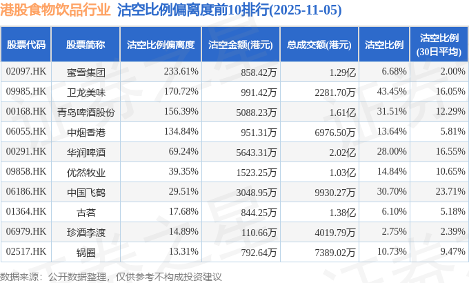 从沽空比例偏离度来看,蜜雪集团、卫龙美味、青岛啤酒股份沽空比例偏离度位居行业前三,分别为233.61%、170.72%、156.39%。
