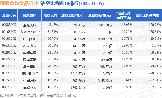 从沽空比例来看,卫龙美味、青岛啤酒股份、中国飞鹤沽空比例位居行业前三,分别为43.45%、31.51%、30.7%。