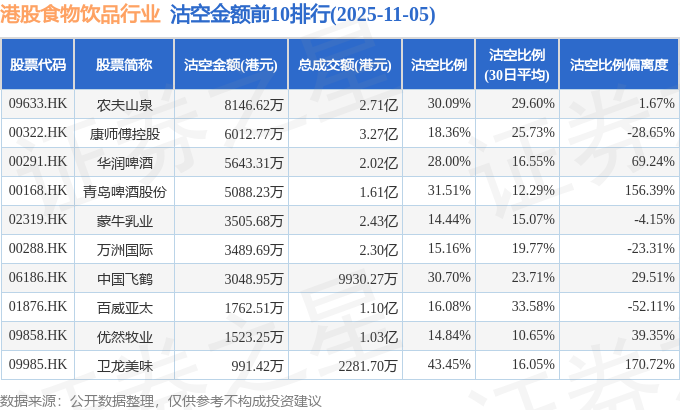从沽空金额来看,农夫山泉、康师傅控股、华润啤酒沽空金额位居行业前三,分别为8146.62万港元、6012.77万港元、5643.31万港元。