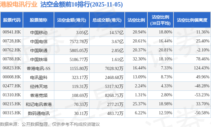 从沽空比例来看,中国铁塔、和记电讯香港、中国移动沽空比例位居行业前三,分别为32.3%、25.37%、20.94%。