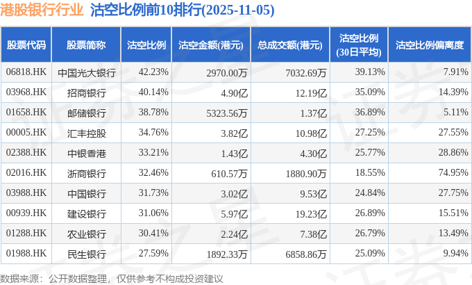 从沽空比例来看,中国光大银行、招商银行、邮储银行沽空比例位居行业前三,分别为42.23%、40.14%、38.78%。