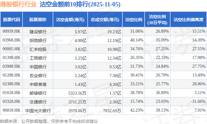 从沽空金额来看,建设银行、招商银行、汇丰控股沽空金额位居行业前三,分别为5.97亿港元、4.9亿港元、3.82亿港元。