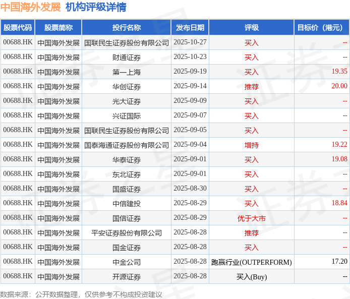 截至2025年11月6日收盘,中国海外发展(00688.HK)报收于13.07港元,上涨1.32%,成交量1150.25万股,成交额1.5亿港元。投行对该股的评级以买入为主,近90天内共有11家投行给出买入评级,近90天的目标均价为18.95港元。国联民生证券股份有限公司最新一份研报给予中国海外发展买入评级。