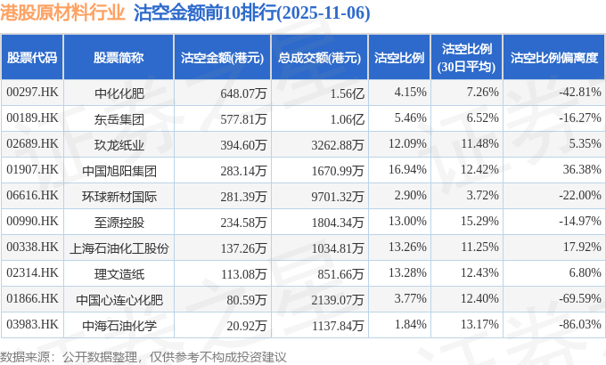 从沽空金额来看,中化化肥、东岳集团、玖龙纸业沽空金额位居行业前三,分别为648.07万港元、577.81万港元、394.6万港元。