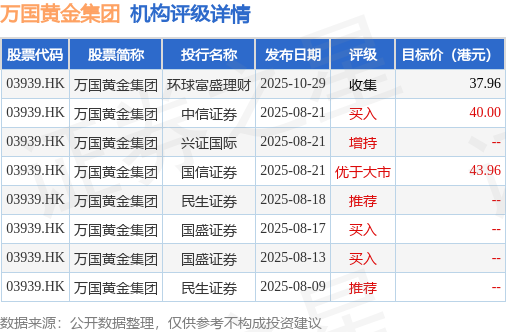 投行对该股的评级以买入为主,近90天内共有3家投行给出买入评级,近90天的目标均价为40.64港元。环球富盛理财最新一份研报给予万国黄金集团收集评级,目标价37.96港元。